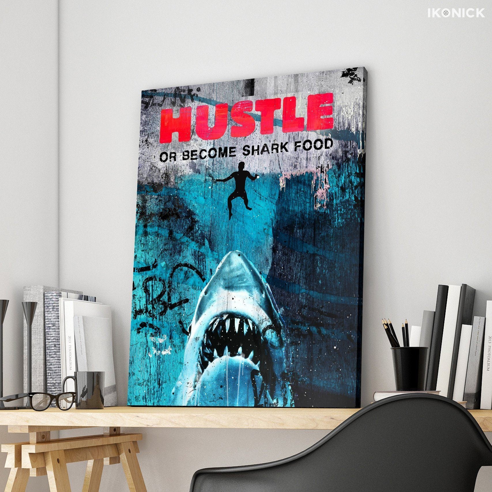 Featured quote, "Hustle or become shark food." Sink or swim, you cannot do both. In these waters, fish aren't friends. Eat or be eaten with this colorful, Banksy inspired canvas art featuring the king of the sea.